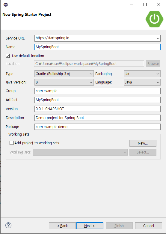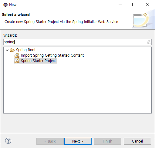 그런 뒤에 File-New-Other탭으로 가서 Spring Starter Project를 생성합니다.(빌드 타입은 Gradle로 설정해주세요)