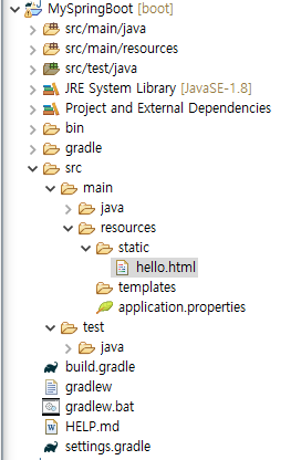 src/main/resources/static 폴더 하위에 hello.html이라는 파일을 만듭니다.