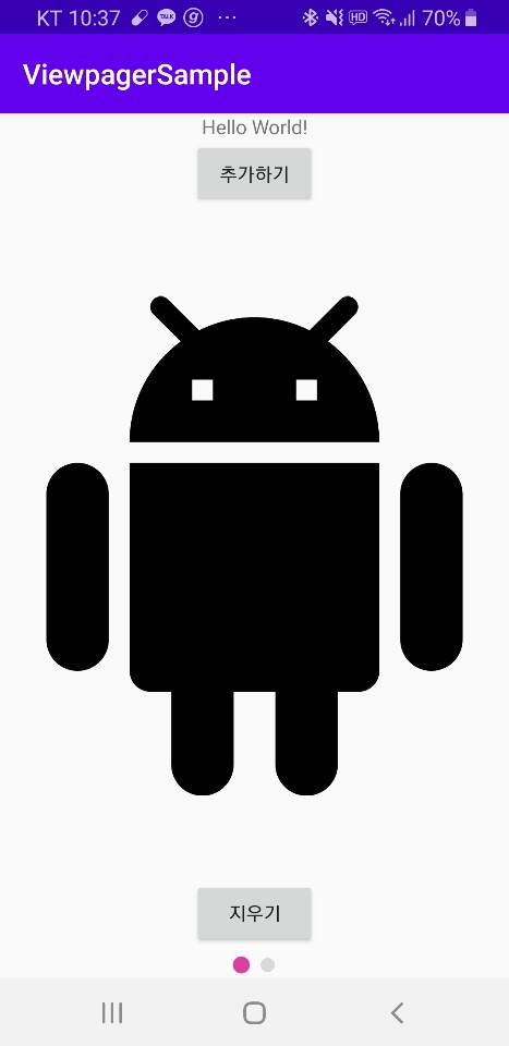 반대로 아래의 지우기 버튼을 누르면 현재 위치의 viewpager item이 삭제됩니다. indicator 또한 이전 또는 이후(인덱스가 0인경우) item으로 인덱스가 변경되고 삭제됩니다.