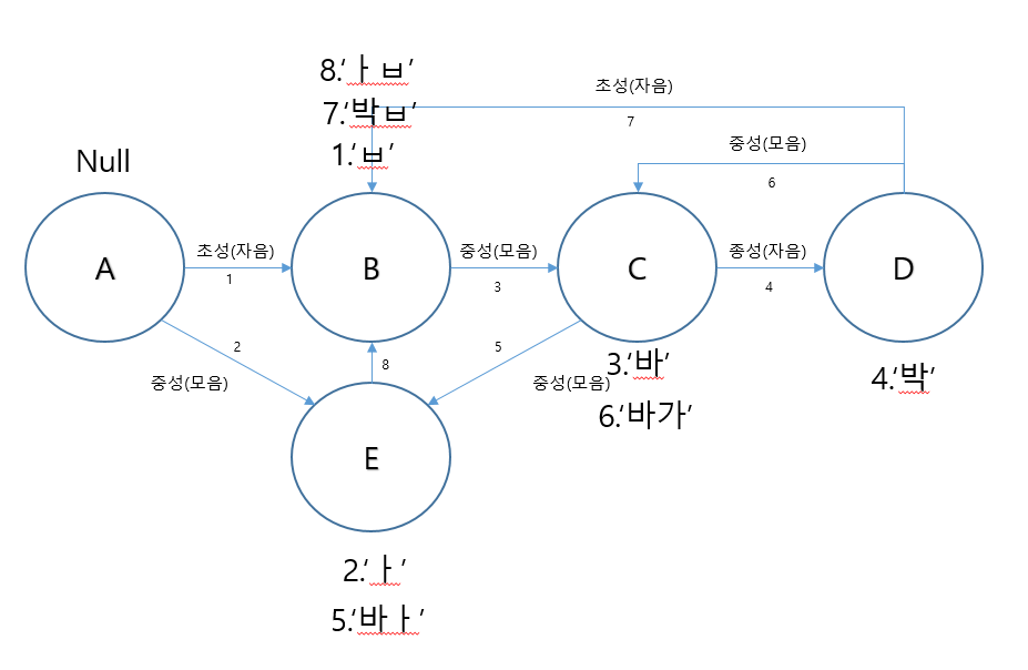 한글입력에는 크게 초성, 중성, 종성으로 나누어져 있고, 현재 상태에서 들어오는 종류에 따라 각각 다른 상태로 이동하게 됩니다.