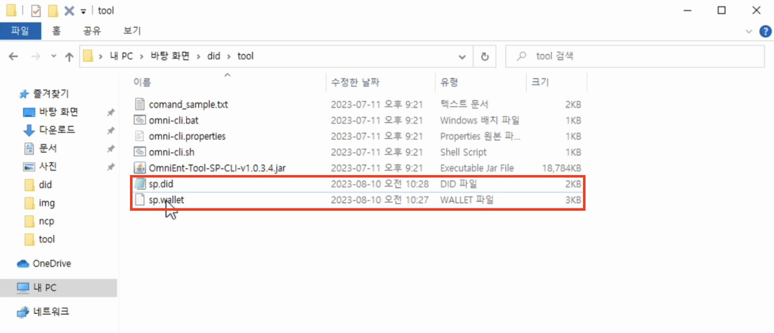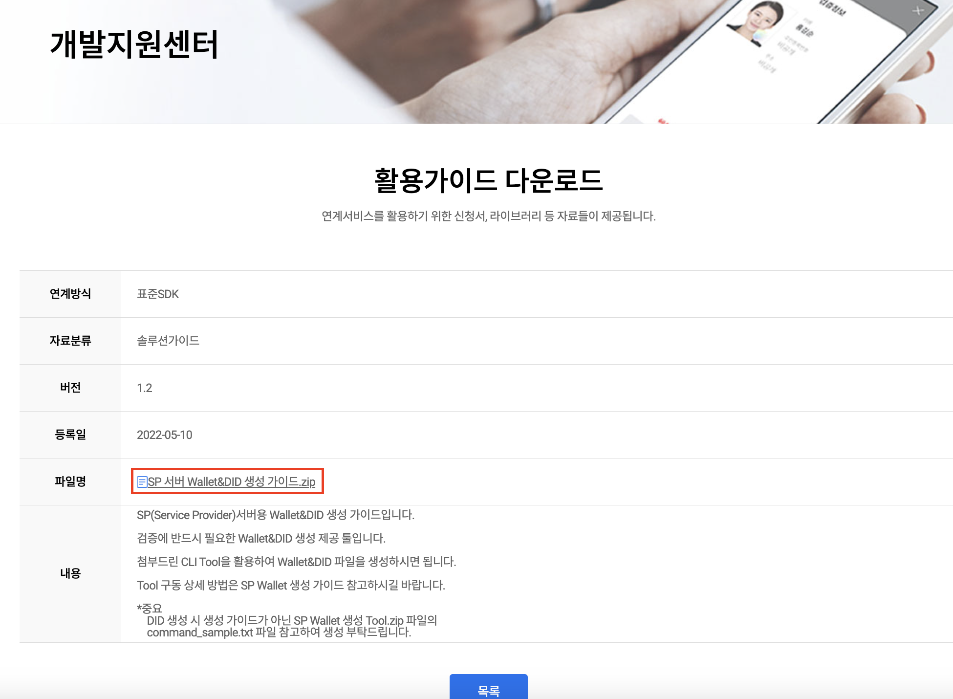 개발지원센터의 기술지원 - 활용가이드 다운로드의 SP 서버 Wallet&DID 생성 가이드를 다운로드 받습니다.