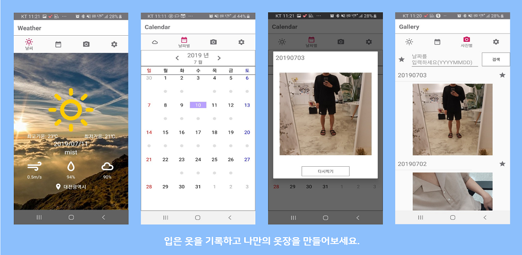 앱은 실행하면 최초로 나오는 날씨 확인화면(OpenWeather API사용), 날짜별로 등록 사진 유무를 확인하거나, 사진을 앱에 저장하기 또는 찍기 기능을 가진 달력 화면 그리고 즐겨찾기, 검색 기능을 가진 최근순으로 정렬된 사진별 모아보기 화면으로 이루어져 있습니다.
